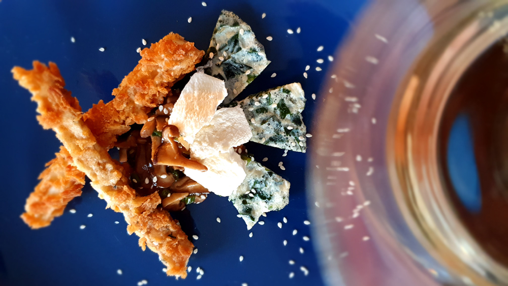 Graffiti aubergine tempura, teriyaki shi-take, zeewieromelet en kefir kaas (voorgerecht)