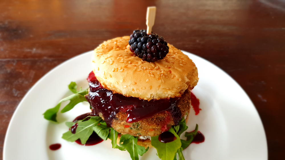 Basilicum-kaasburger met bietjes en bramensaus (lunchgerecht)